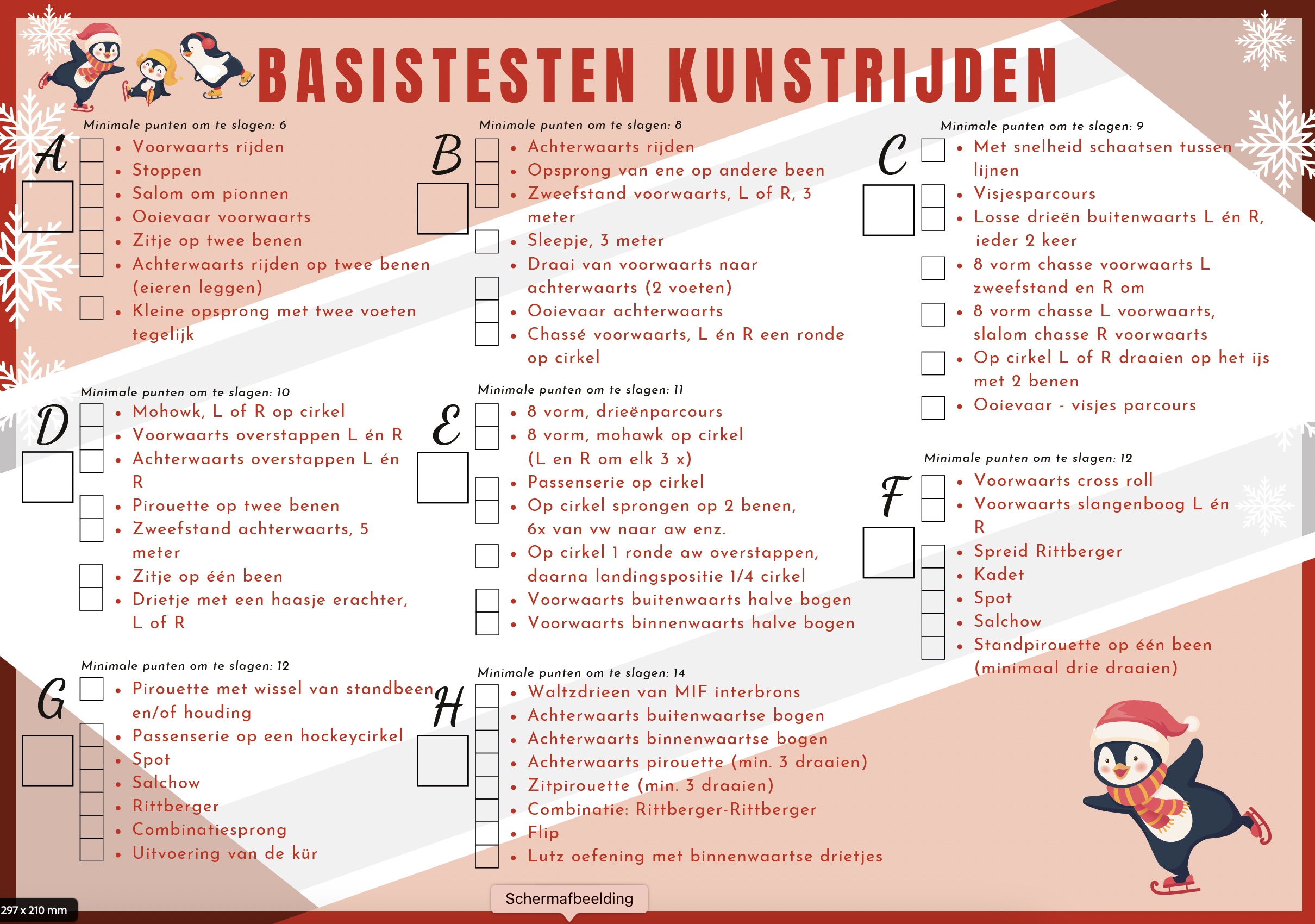 Om de voortgang van je technische schaatsvaardigheid te monitoren werken we met basistesten. Per basistest (diploma) wordt aangegeven wat je allemaal hebt geleerd tijdens de kunstschaatslessen.